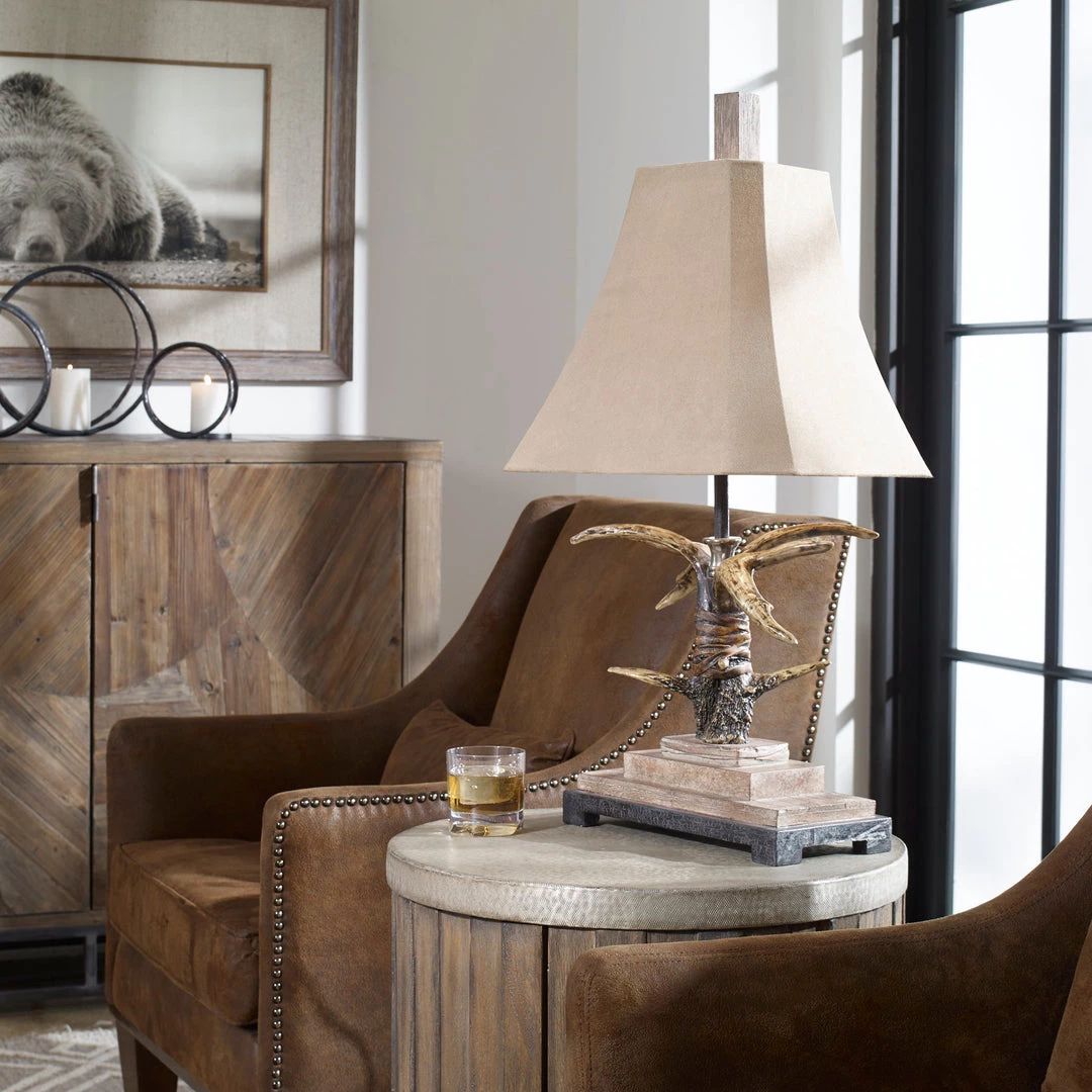 This Masculine Lamp Is Finished In A Natural Brown And Ivory With Scratched Silver And Cast Aluminum Accents. The Brushed Palomino Sueded Shade Is A Rectangle Bell With Clipped Corners.