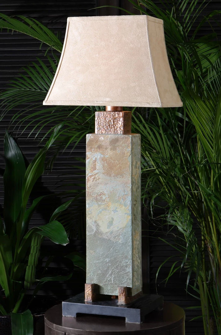 This Indoor/outdoor Lamp Is Made Of Real Hand Carved Slate With Hammered Copper Details. Due To The Natural Material Being Used Each Piece Will Vary. The Rectangle Bell Shade Has A Brushed Suede, Weather Resistant Fabric.