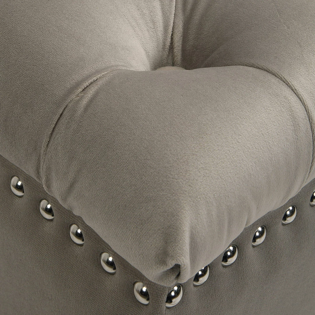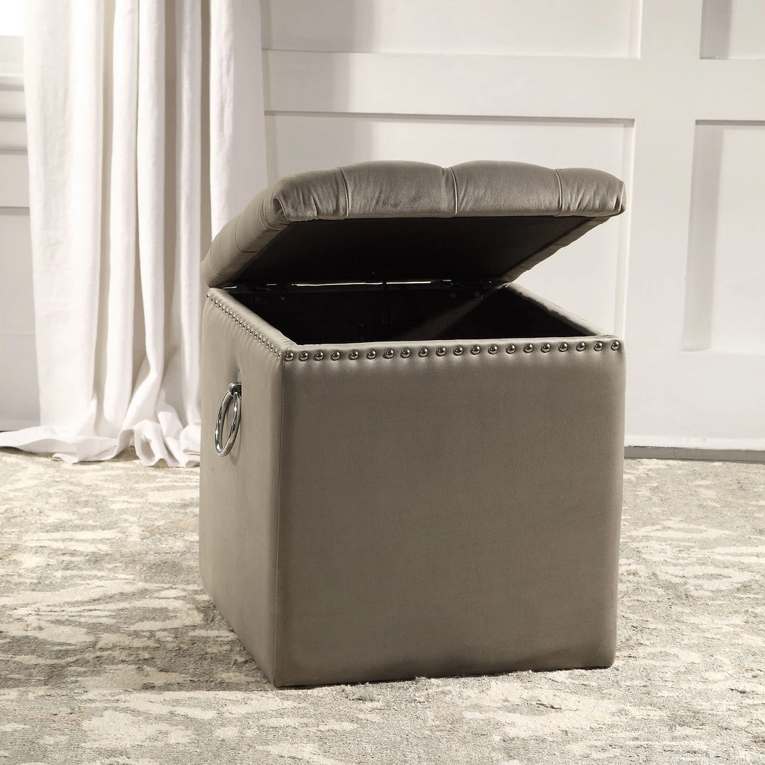 Covered In A Luxurious Champagne Velvet, This Plush Button Tufted Lid Opens Up For Concealed Storage With An Interior Safety Hinge. Complete With Polished Nickel Ring Pulls And Nail Head Trim.