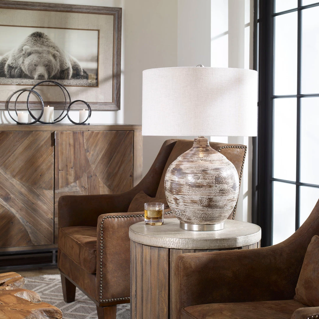 Heavily Textured Ceramic Base Finished In A Distressed Blue-gray Glaze With Rust Bronze Undertones, Accented With Brushed Nickel Plated Details. The Round Hardback Drum Shade Is A Light Beige Linen Fabric With Natural Slubbing.