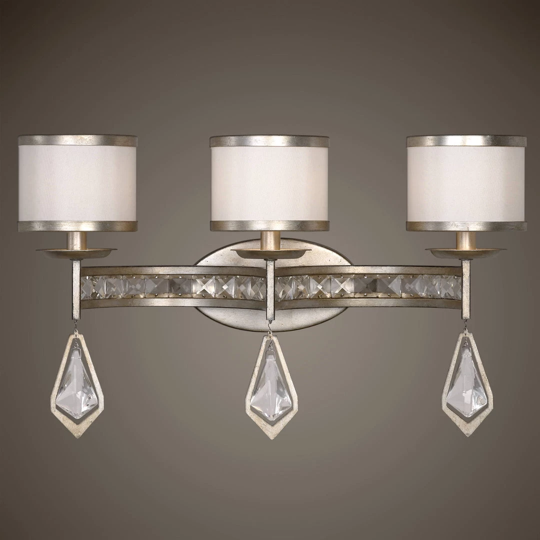 Burnished Silver Champagne Leaf Finish With Modern Clear Crystal Accents Highlight This Majestic Vanity Light Along With Silken Off White Hardback Shades.
