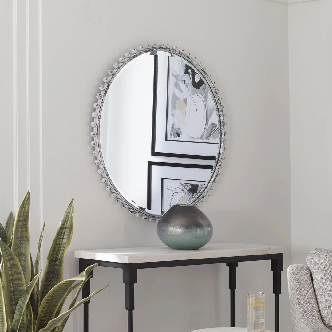 Petite Iron Spheres Line The Outer Edge Of This Round Frame, Finished In A Heavily Distressed Aged White With Rustic Black Undertones. Mirror Features A Generous 1 1/4″ Bevel.