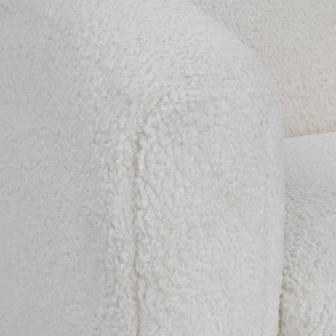 With Its Curved Track Arms And Supportive Back, This Cozy Accent Chair Is The Perfect Balance Of Comfort And Style. Fully Upholstered In A Soft Off White Faux Shearling And Accented By Walnut Stained Wooden Feet. Seat Height Is 18″.