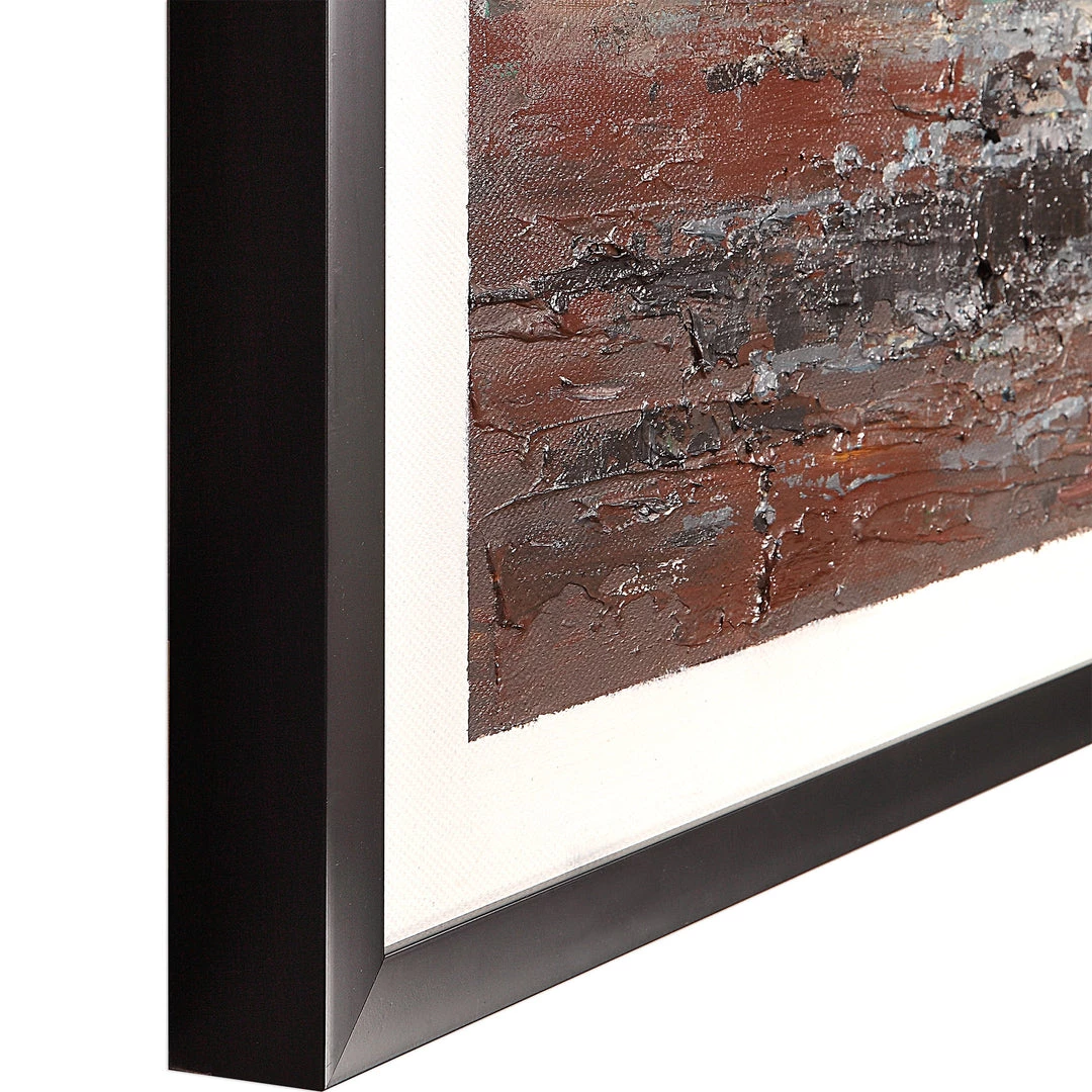 Modern In Design, This Hand Painted Abstract On Canvas Presents A Masculine Style. Deeply Textured Shades Of Gray, Tan, And Soft Yellow Fade To Darker Red-brown, Blue, And Green Hues. An Unpainted White Canvas Border Surrounds The Artwork. A Wooden, Black Satin Frame Completes The Piece. Due To The Handcrafted Nature Of This Artwork, Each Piece May Have Subtle Differences.