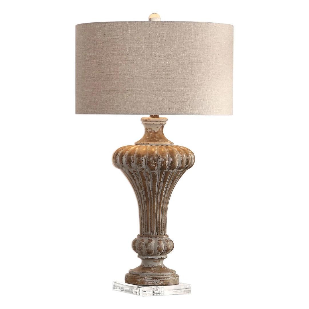 This Updated Look On An Ornate Traditional Style Features A Hand Painted Aged Pecan Finish With A Heavily Distressed Antique Gray Wash, Accented With Thick Crystal Details. The Round Hardback Drum Shade Is A Light Beige Linen Fabric With Natural Slubbing.