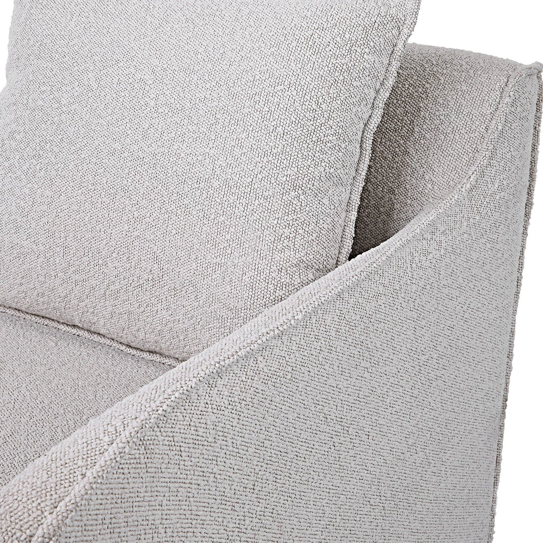 Casual Swivel Accent Chair Features A Tailored Slipcover Made From Ivory And Warm Gray Boucle Fabric With Flanged Edges And A Matching Square Pillow. The Hardwood Swivel Base Is Finished In A Natural Ceruse. Seat Height Is 18″.