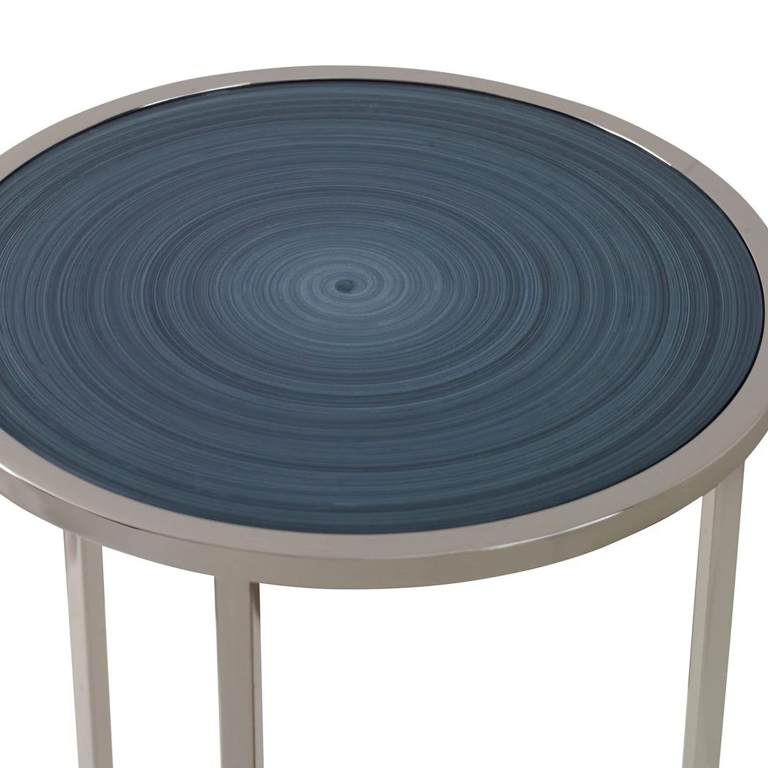 This Contemporary Style Drink Table Features A Round Back-painted Tempered Glass Top In A Unique Charcoal, Light Gray And White Swirl Design, Accented By A Sleek Polished Nickel Plated Stainless Steel Base.