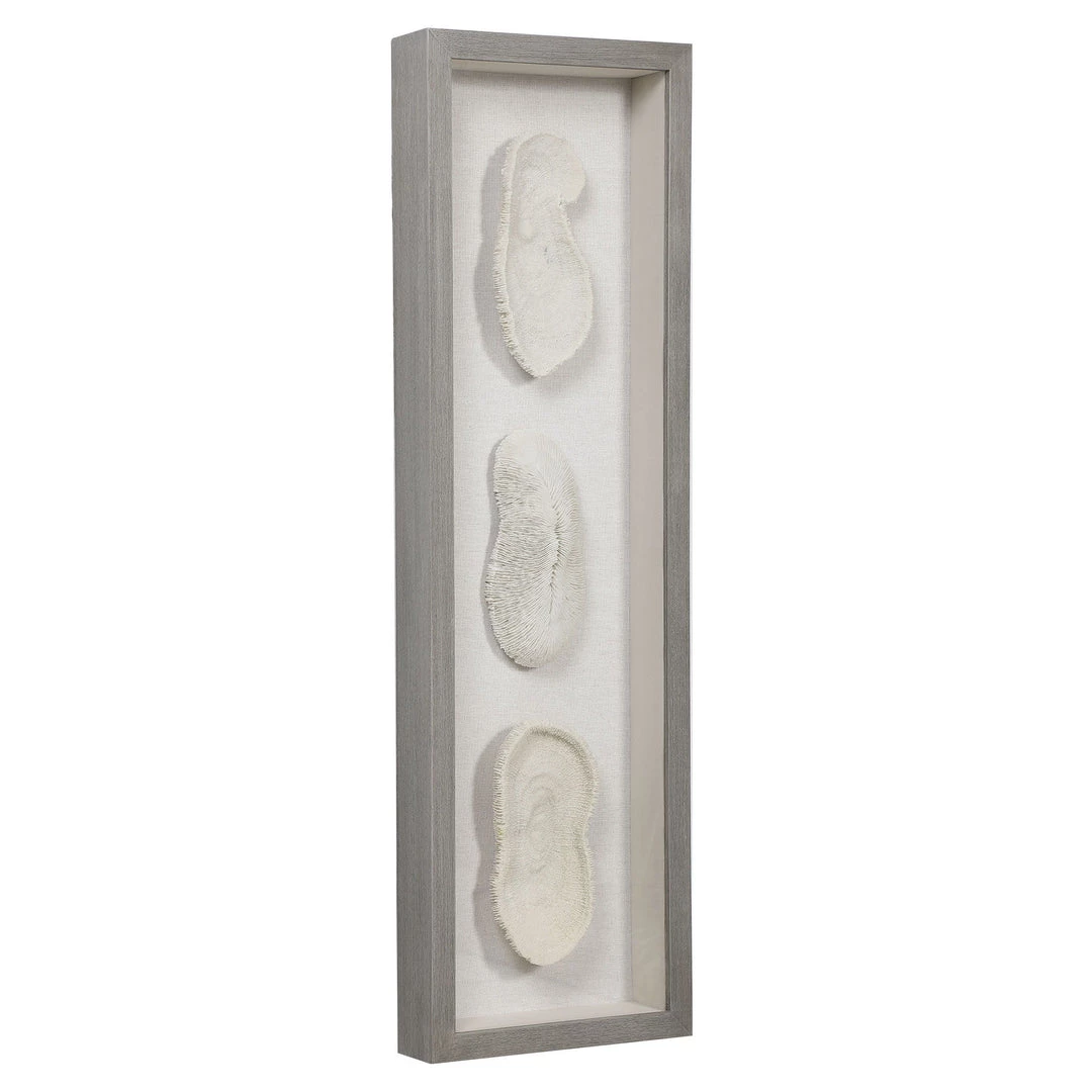 Reminiscent Of Preserved White Coral, This Shadowbox Design Exudes Refined Coastal Style. The Shadow Box Style Frame Has A Light Gray Finished Pine Wood Exterior With A Beige Linen Backing. May Be Hung Horizontal Or Vertical.