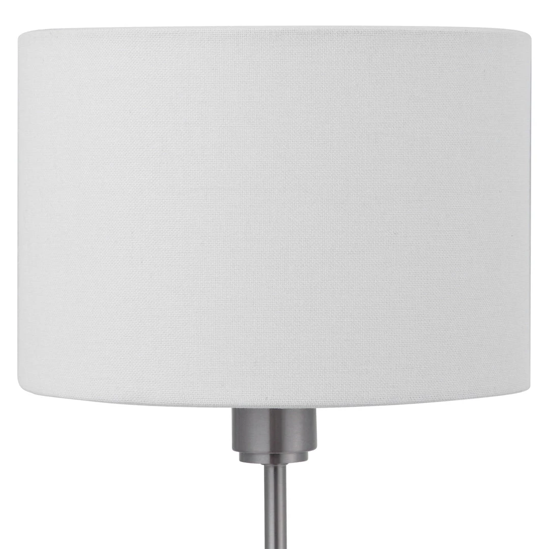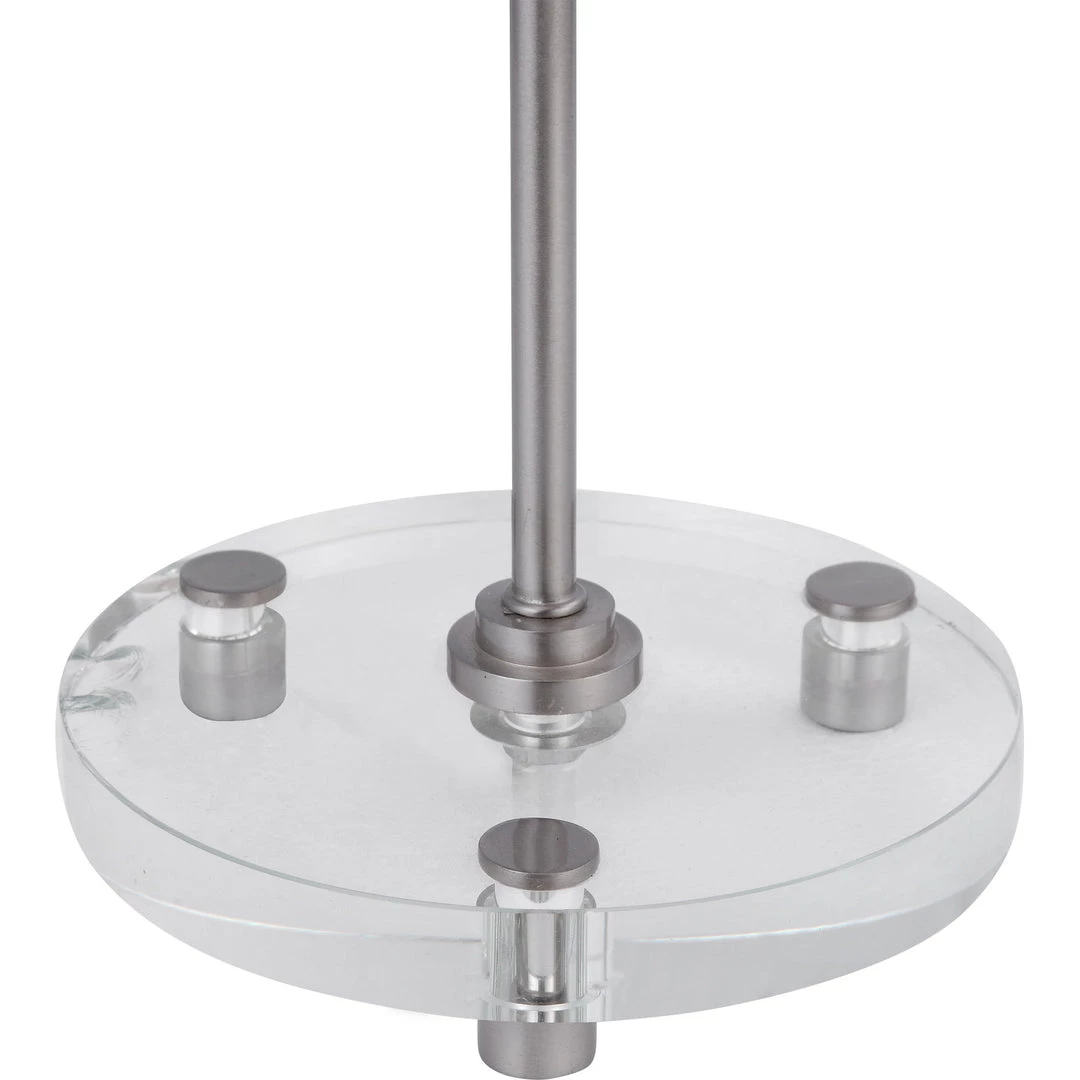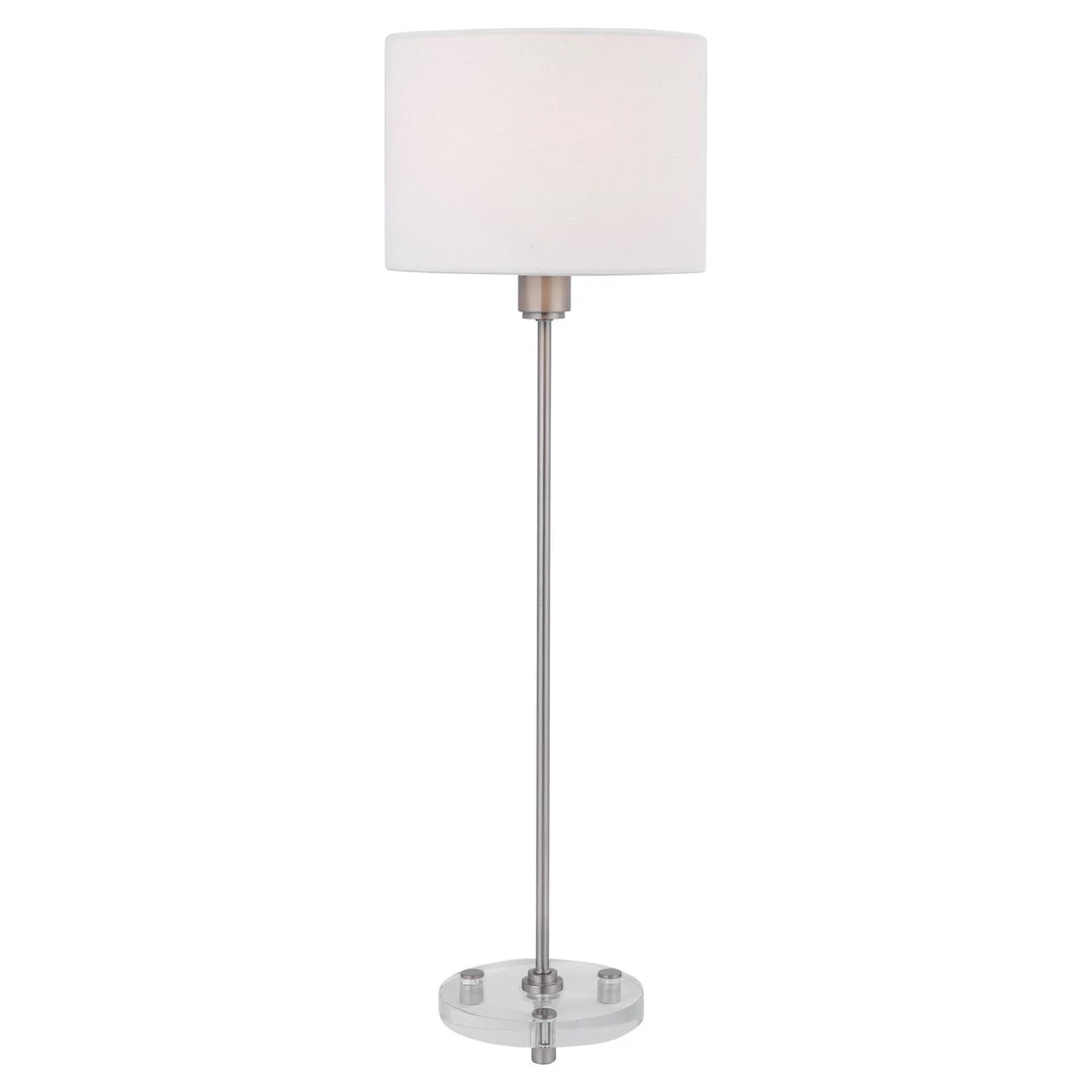 This Simple, Contemporary Buffet Lamp Features Clean Lines And A Versatile Style. The Iron Base Is Finished In A Plated Brushed Nickel, Displayed On A Thick Crystal Foot. The Round Hardback Drum Shade Is A White Linen Fabric.