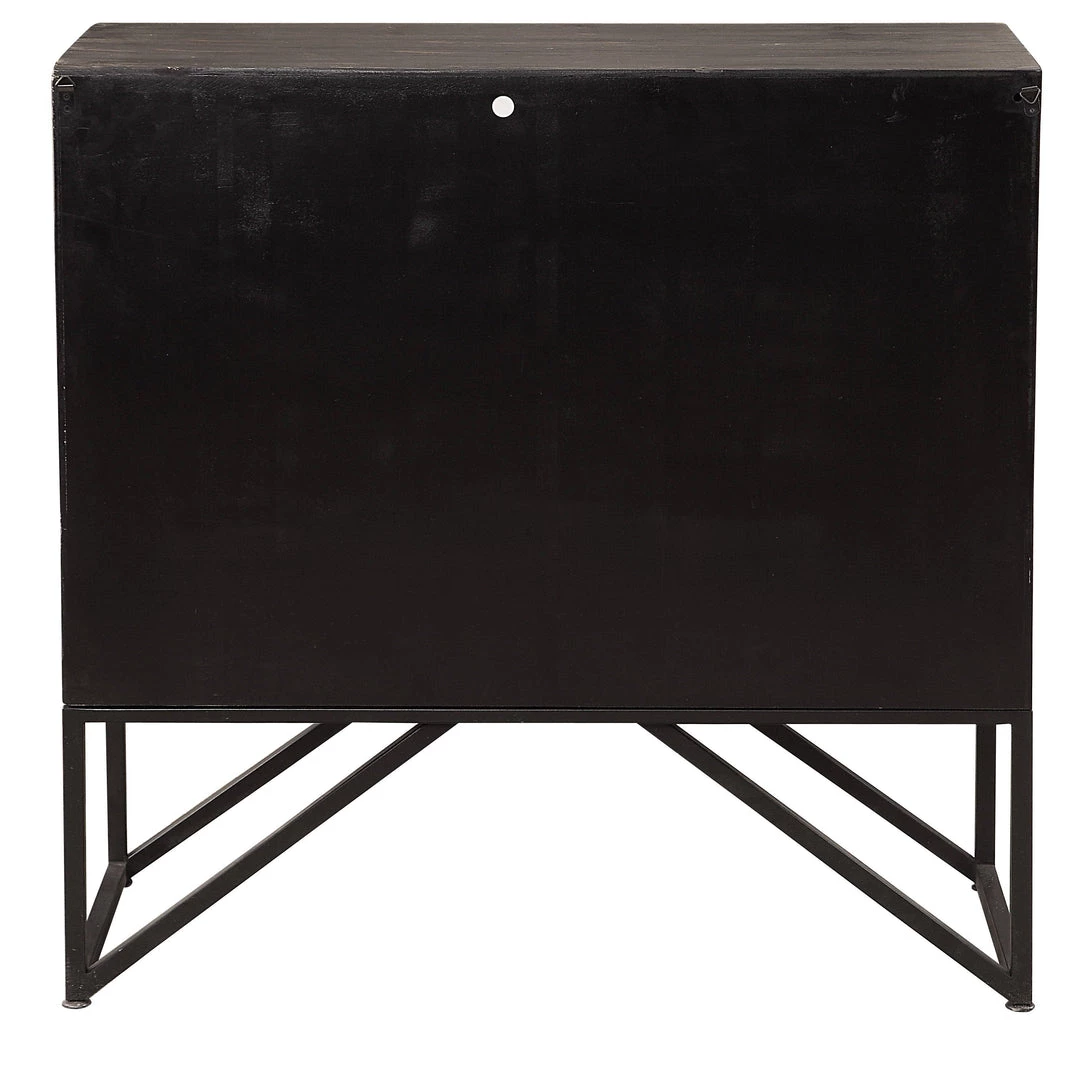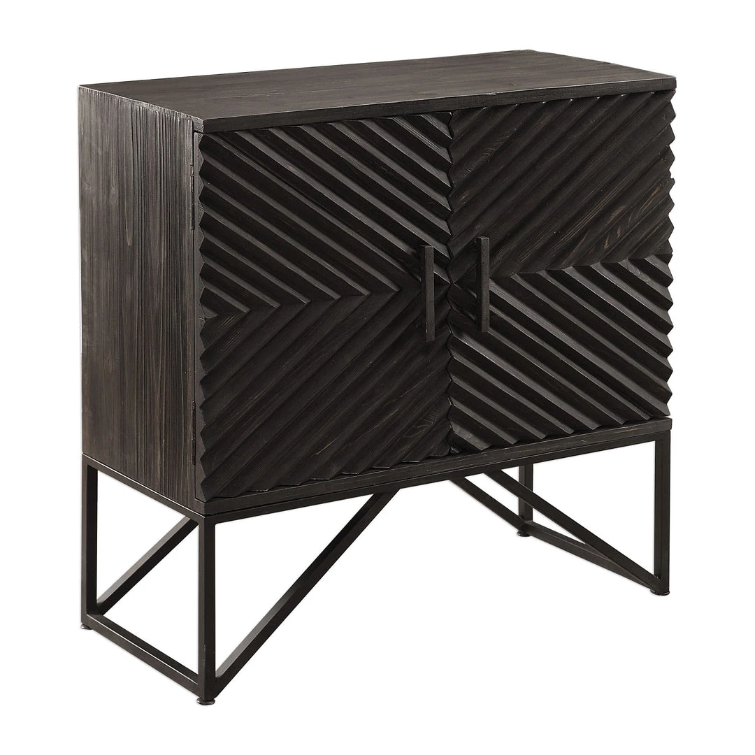 Intricately Pieced With A Modern 3-dimensional Book Matched Chevron Pattern In Aged Ebony Finished Fir Wood, Contrasting With A Naturally Finished Rustic Top. Supported By An Iron Base And Accented With Thick Iron Bar Hardware Finished In Black Steel. Has One Fixed Interior Shelf.